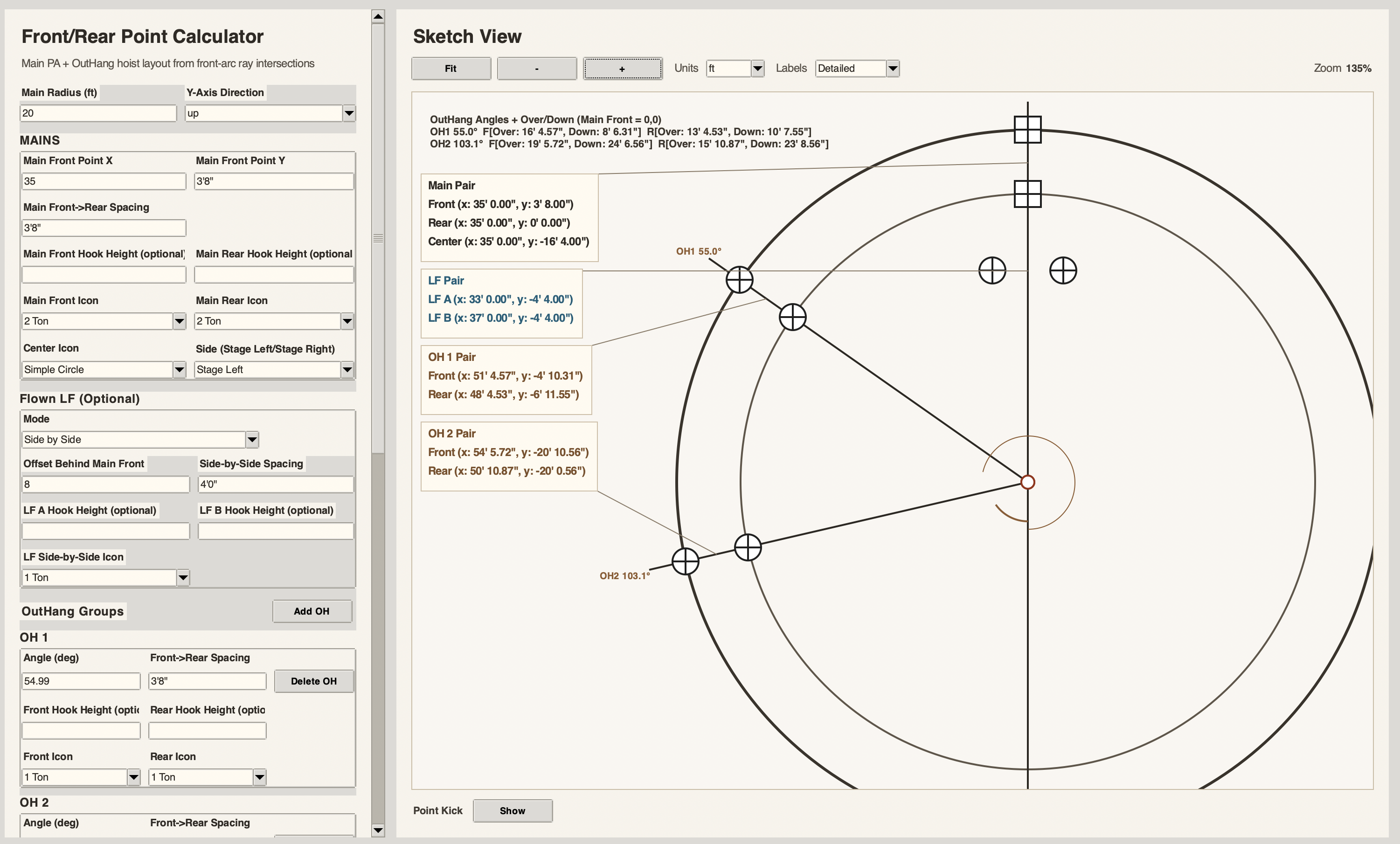 Compute center, ray intersections, and key spacing distances from practical field inputs, then verify results instantly in a scaled sketch and step-by-step math view.